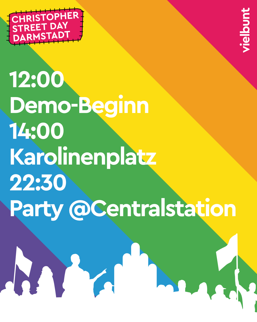 Wow! Das war ein großartiger CSD Darmstadt 2025 mit 7.000 Menschen! Vielen Dank an euch alle, die diesen tollen Tag möglich gemacht haben. Die Arbeitsgruppe CSD von vielbunt, die weit über hundert Helfer*innen auf der Demo und dem Fest und allen, die gekommen sind, um mit uns gemeinsam, friedlich, bunt und laut für Vielfalt und unsere Demokratie auf die Straße zu gehen. Wir atmen kurz durch und dann gehts im Herbst auch schon wieder los für die Planungen des CSD 2026! Wenn ihr Lust bekommen habt mitzumachen, schaut doch einfach mal bei unseren Schnuppersitzungen vorbei. Die Termine dazu gibt’s in Kürze hier.